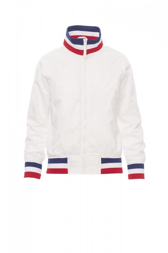 000136 - Giubbino da uomo, zip bianca in plastica con cursore in metallo, con colletto, polsini e vita in rib con colori bandiera, due tasche esterne interno: non imbottito, fodera in drytech, una tasca interna e zip per agevolare stampe e ricami. Composizione: NYLON 210T 65GR